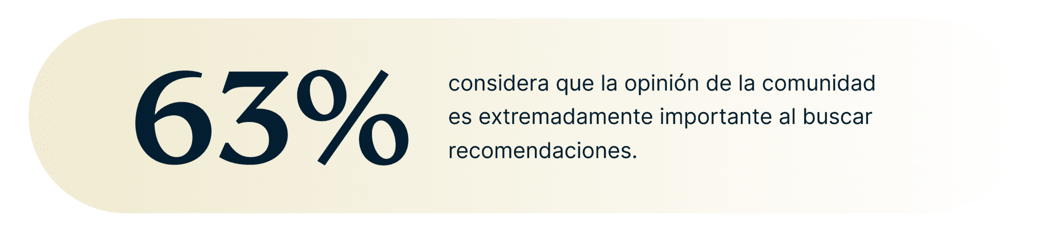 Nuestra encuesta muestra que el 63% de las personas considera que la opinión de la comunidad es importante o extremadamente importante al buscar recomendaciones. Esto destaca el poder del contenido generado por usuarios, donde las experiencias reales y las perspectivas tienen más peso que la información puramente objetiva.