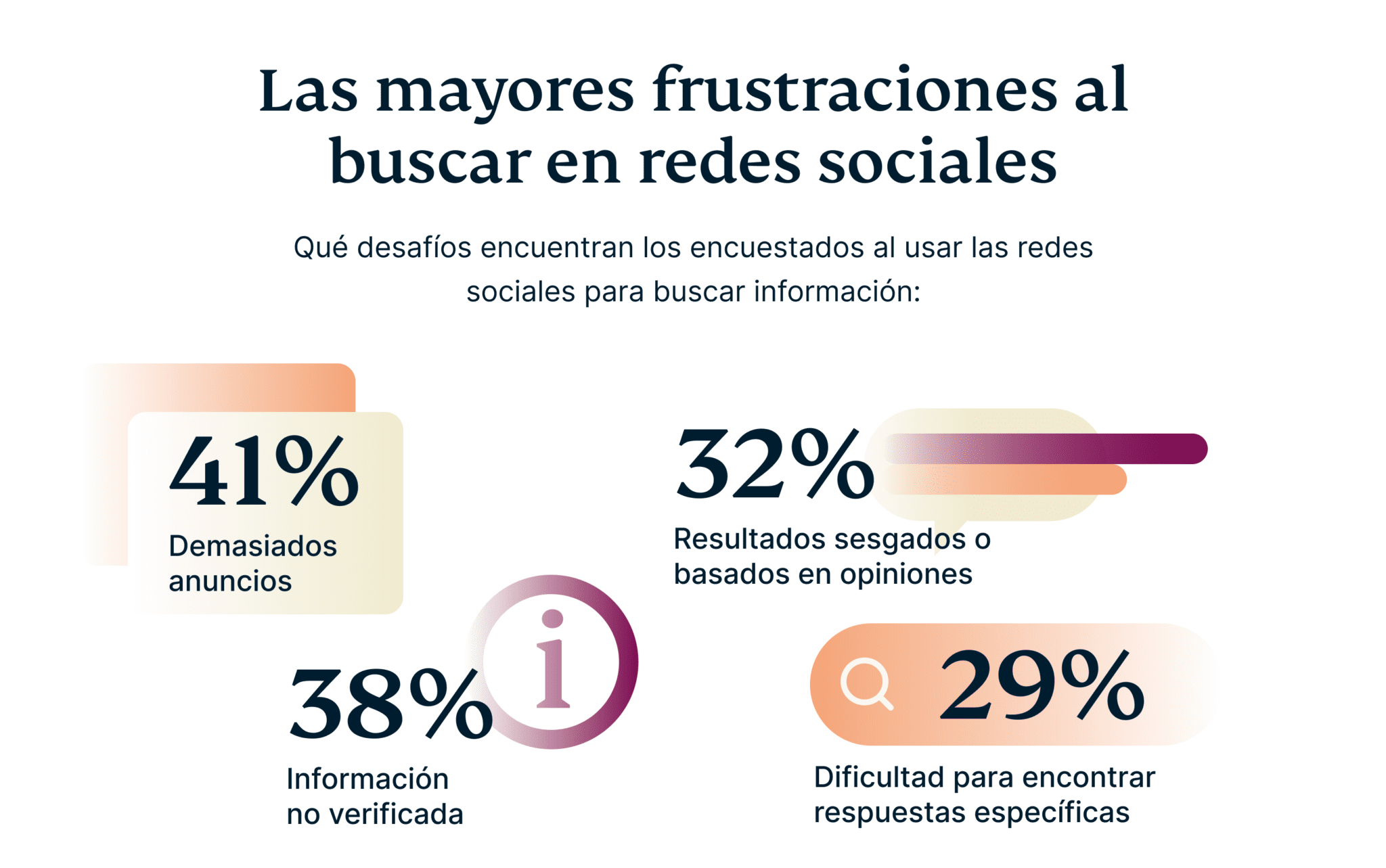 Si bien las redes sociales ofrecen una forma dinámica y atractiva de encontrar respuestas, no están exentas de desventajas. Para muchos usuarios, frustraciones como los anuncios intrusivos, la información no verificada y el contenido sesgado pueden hacer que la experiencia de búsqueda sea menos fluida de lo que parece. De hecho, nuestra encuesta muestra que estos desafíos son la razón por la cual algunos todavía dependen de herramientas tradicionales como Google para ciertas búsquedas.