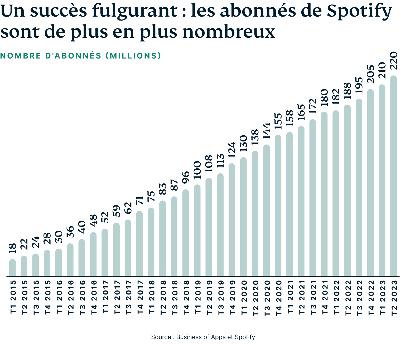 Spotify a connu une évolution significative depuis son lancement en 2008. En tant que précurseur dans le domaine du streaming musical premium, Spotify a séduit un million d'utilisateurs au cours des cinq premiers mois de son lancement. Depuis cette année, il compte environ 515 millions d'utilisateurs actifs mensuels. C'est la plateforme musicale la plus populaire au monde.