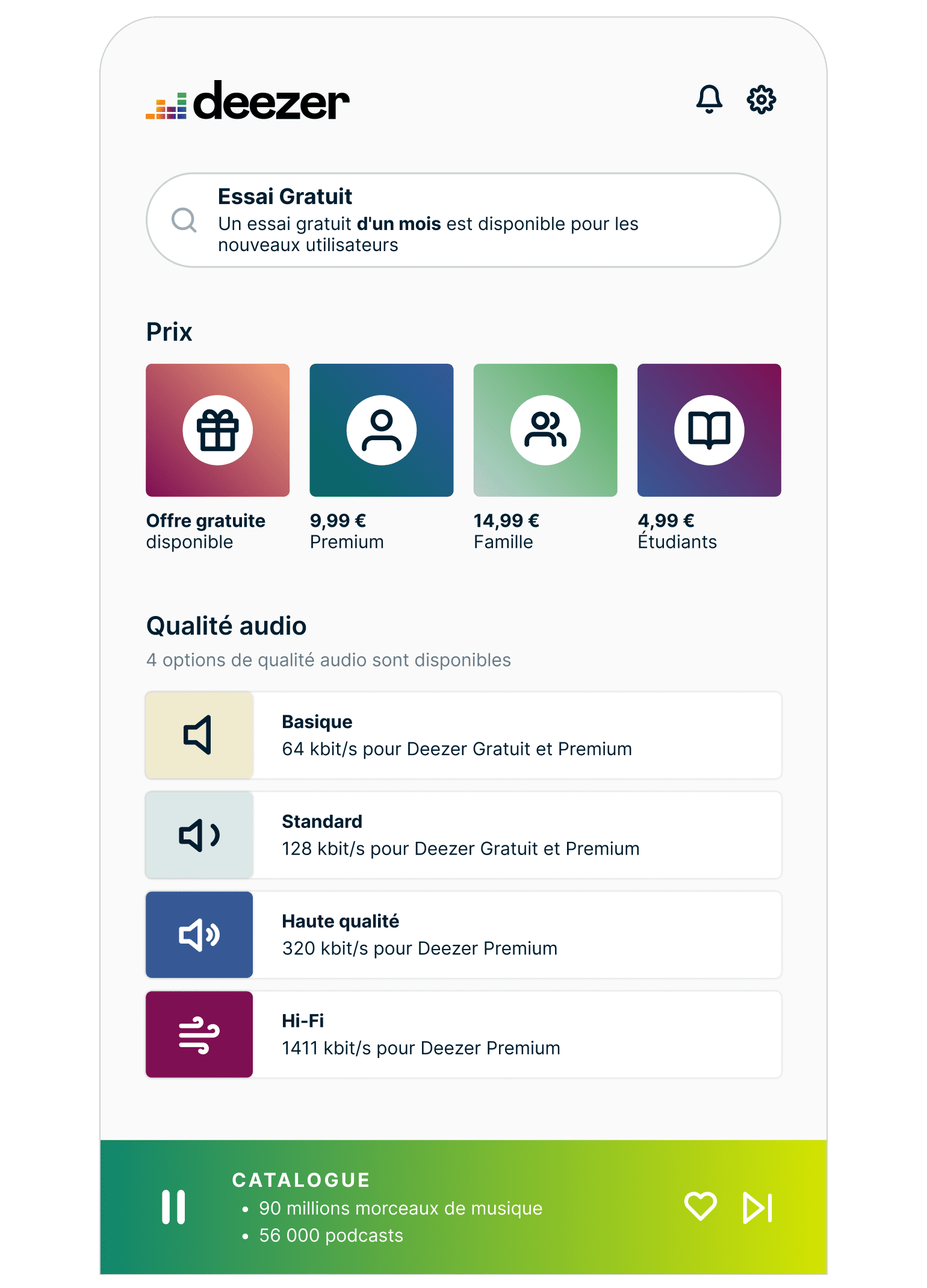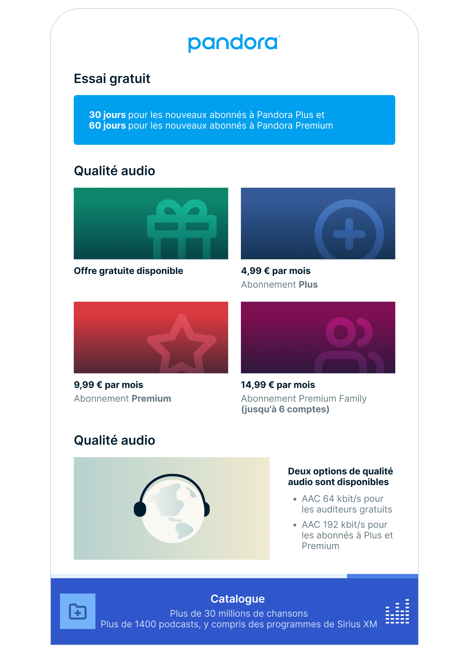 • D'autres plateformes comme Deezer, Tidal et Pandora proposent des offres et des tarifs uniques – axés sur la découverte de musique – et une qualité audio supérieure.