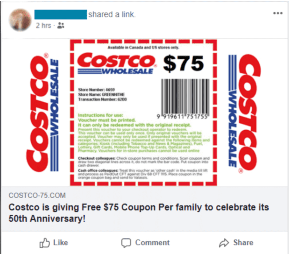 Un exemple d'arnaque de faux coupons sur Facebook implique des escrocs qui promouvaient une fausse offre de coupon Costco ; Crédit : Facebook