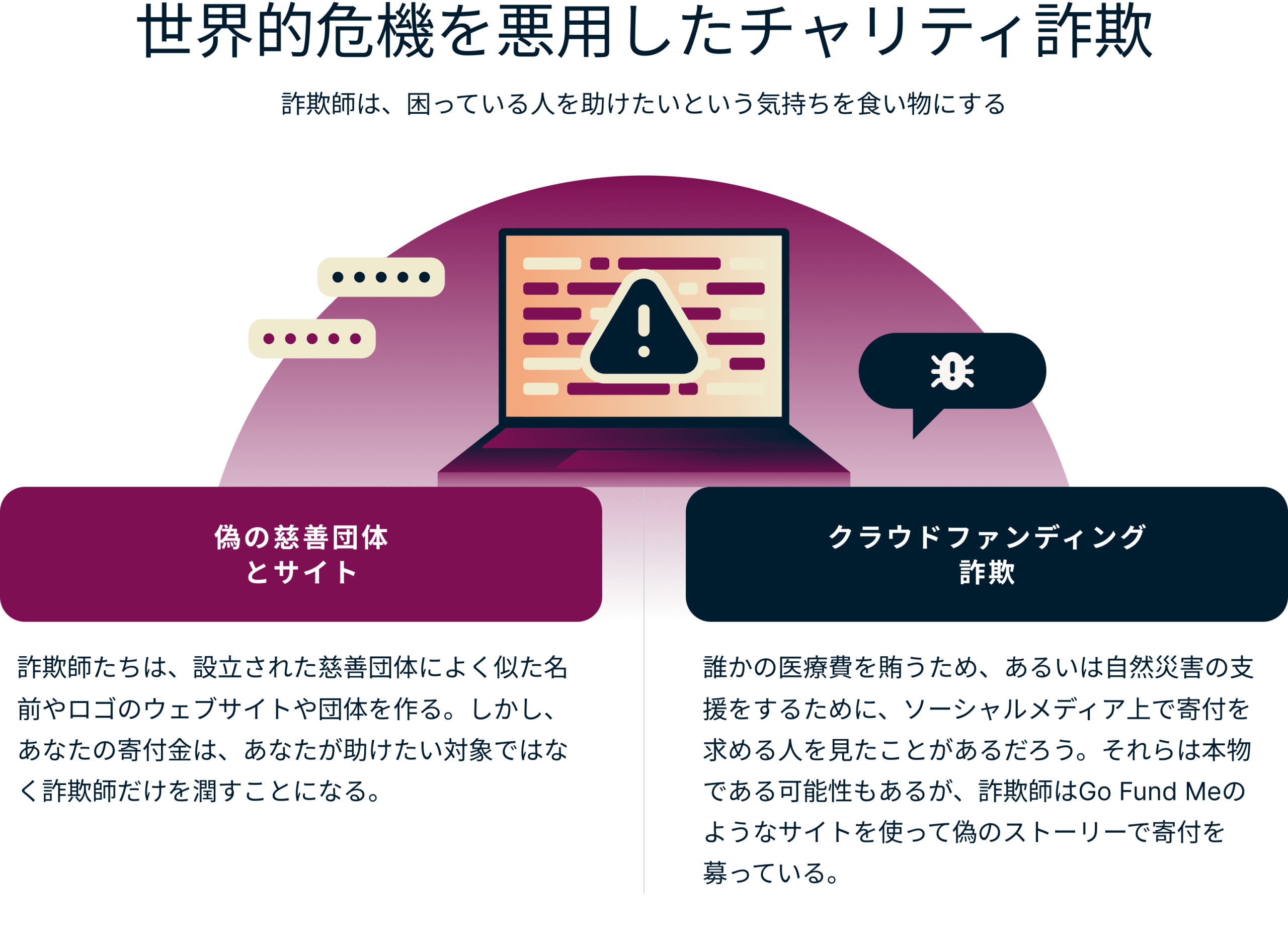 自然災害から人道的緊急事態まで、世界的な危機は「助けたい」という強い衝動を呼び起こします。しかし、詐欺師たちは、慈善活動を装って手の込んだ詐欺の網を張り巡らし、自分たちの利益のためにこの心を悪用します。