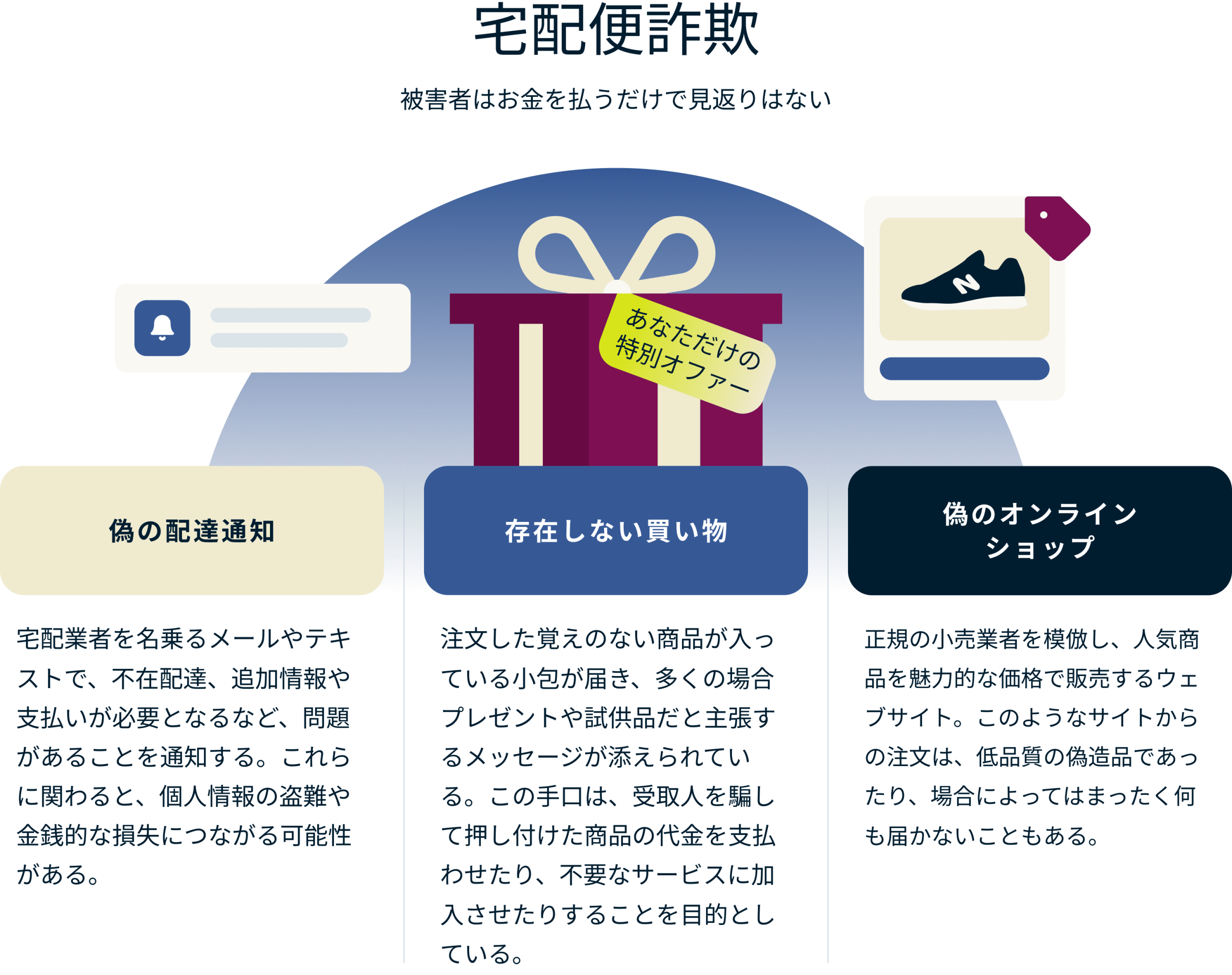 • 身に覚えのない荷物は避ける: 注文した覚えのない荷物が届いたり、未承諾の宅配料金の支払いを要求されたりした場合は注意しましょう。そのような場合は配送業者に報告し、不審なメッセージには関わらないようにしましょう。