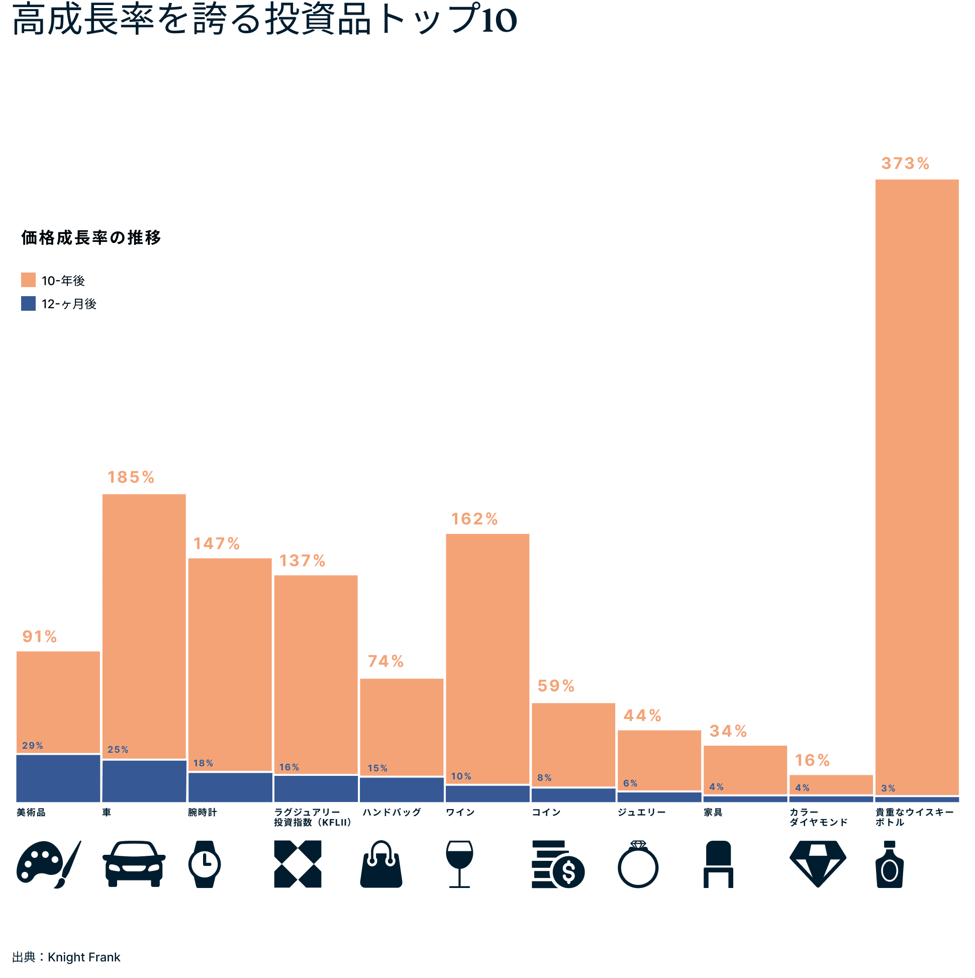 • 希少なウイスキー、美術品、高級品、車などのコレクション(実物資産)への投資は、ビットコインに比べて比較的安定しており、高いリターンが期待できる