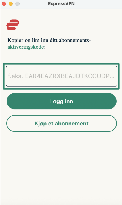 - Oppgi aktiveringskoden din for å logge inn på ExpressVPN. Du finner koden i kontrollpanelet ditt når du logger inn på webportalen hos ExpressVPN.