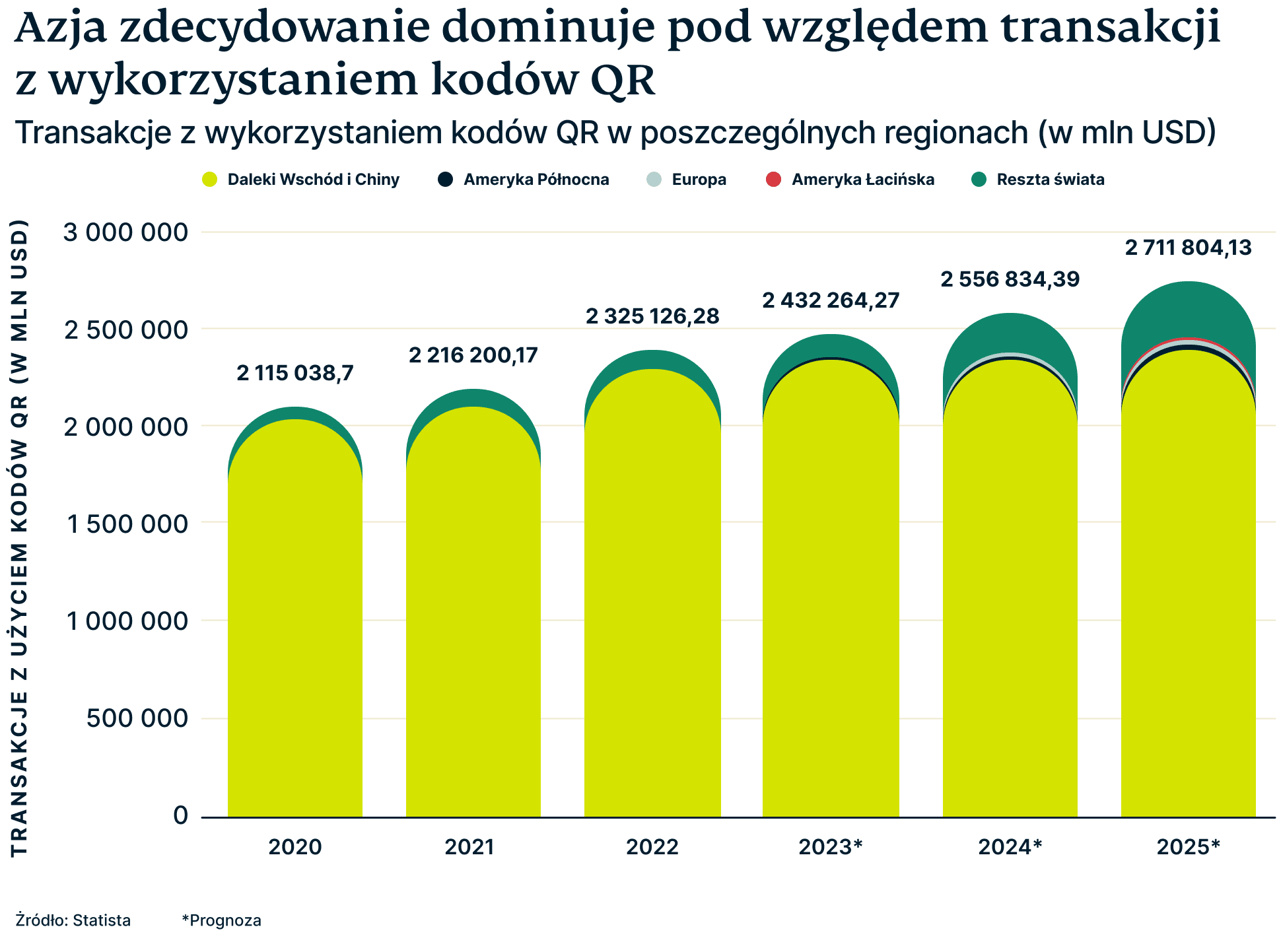 Według Statista w 2023 roku na tym obszarze wartość transakcji dokonanych za pośrednictwem kodów QR przekroczy 2,2 bln USD. Drugie miejsce zajmuje Ameryka Północna, gdzie wartość transakcji za produkty i usługi wyniesie 15,4 mld USD, a trzecie – Ameryka Łacińska, w której kody QR posłużą do dokonania transakcji o wartości ponad 3,4 mld USD.