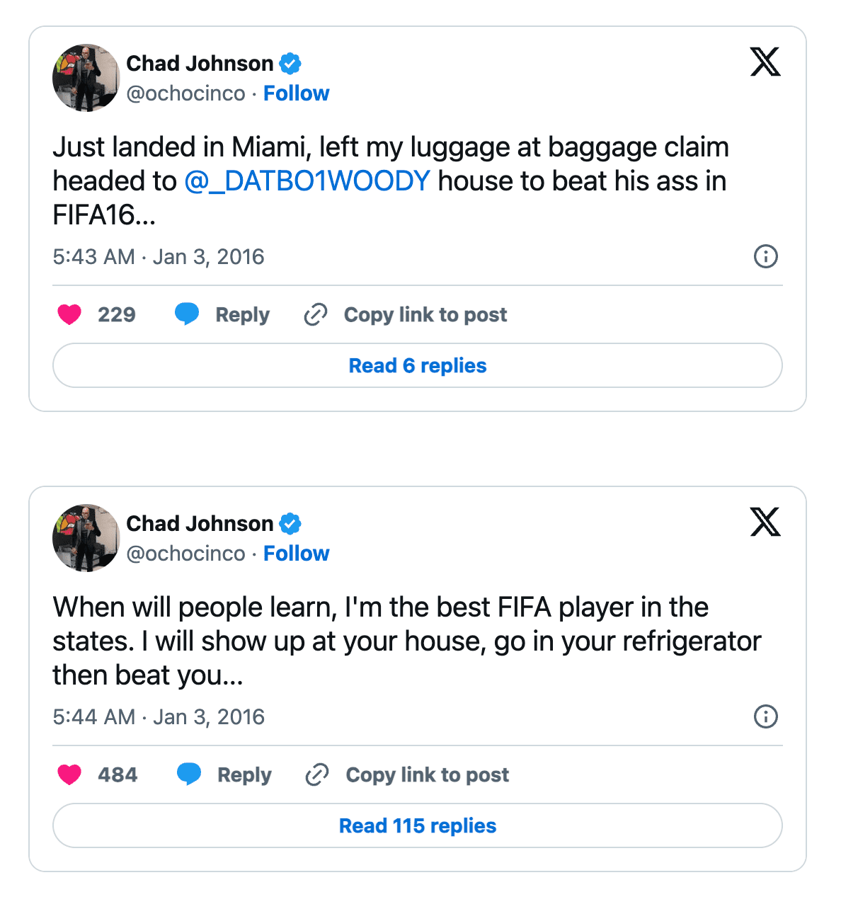 OchoCinco olarak da tanınan Johnson, yalnızca eski bir NFL oyuncusu değil, aynı zamanda oyun topluluğunda önemli bir figür. Johnson, futbol kariyerini sonlandırdıktan sonra rekabetçi ruhunu video oyunları dünyasına taşıdı ve özellikle Madden, Call of Duty ve FIFA gibi oyunlarda başarı gösterdi.