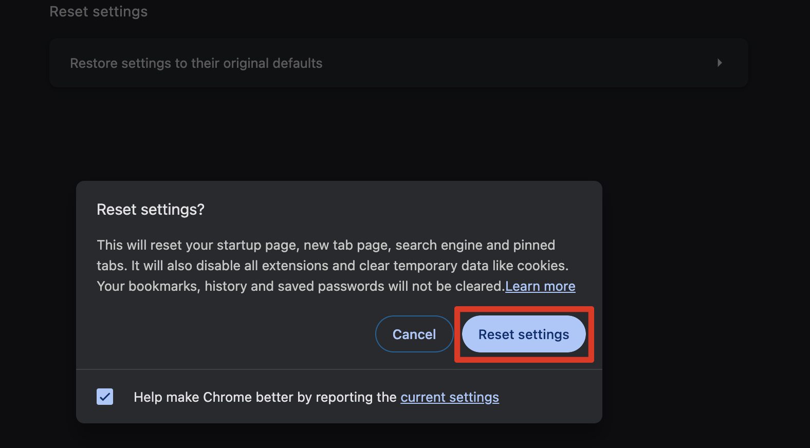4. Select Reset settings to confirm