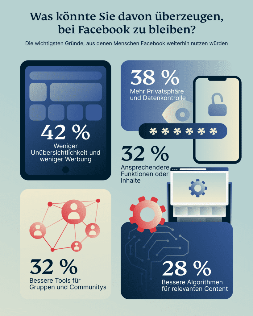 In der Altersgruppe der 18- bis 24-Jährigen sagen 50 %, dass sie andere Plattformen bevorzugen, während 39 % Facebook einfach nicht mehr für notwendig halten. Datenschutzbedenken spielen für diese Gruppe kaum eine Rolle – nur 8 % nennen sie als Grund für den Rückzug. Stattdessen ziehen es diese Nutzer vor, sich auf visuell ansprechende Plattformen wie TikTok und Instagram zu konzentrieren, deren Inhalte Facebook nicht nachbilden kann. Gleichzeitig geben 29 % an, dass sie Facebook seltener nutzen, weil ihre Freunde und Familie dort weniger aktiv sind, und 28 % ärgern sich über irrelevante Werbung und Inhalte.