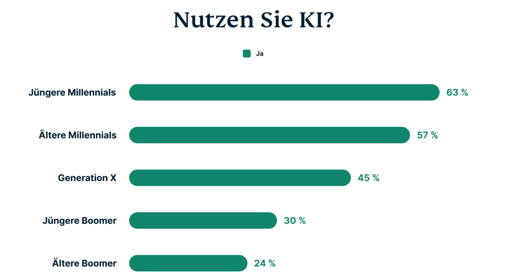 Wenn es darum geht, KI-Tools zu nutzen, gibt es eine deutliche Kluft zwischen den Generationen. Unsere Umfrage zeigt, dass 63 % der jüngeren Millennials in irgendeiner Form mit KI in Berührung kommen, sei es durch Chatbots, intelligente Assistenten oder fortgeschrittenere Anwendungen. Doch je älter die Generationen, desto geringer die Begeisterung. Nur 45 % der Generation X geben an, KI gelegentlich oder regelmäßig zu nutzen, und diese Zahl sinkt bei den über 69-Jährigen auf nur noch 24 %.