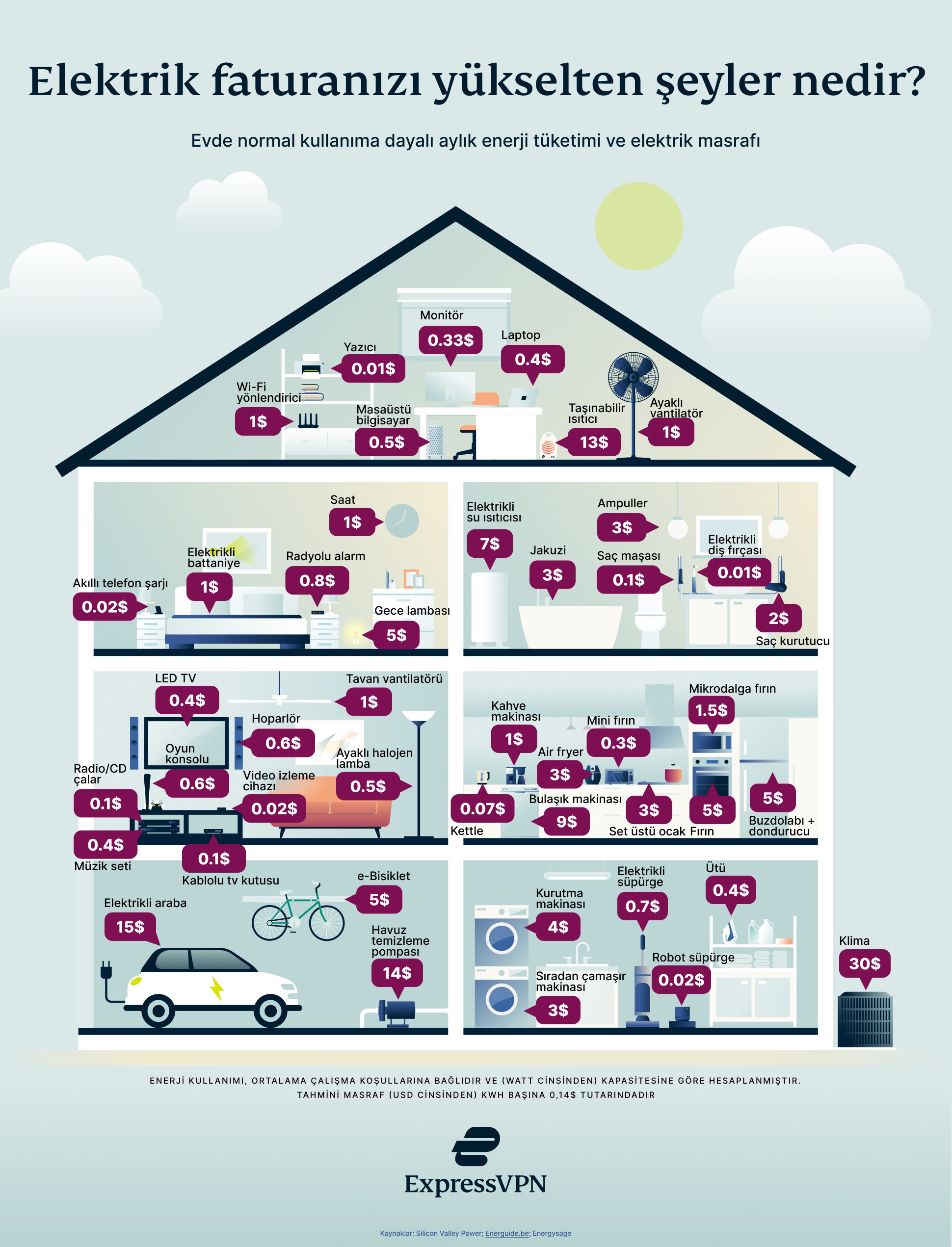 Aşağıdaki infografikte, sıradan bir Amerikalı ailenin evindeki her eşyanın aylık enerji tüketimini ve bundan doğan maliyetini listeliyoruz: