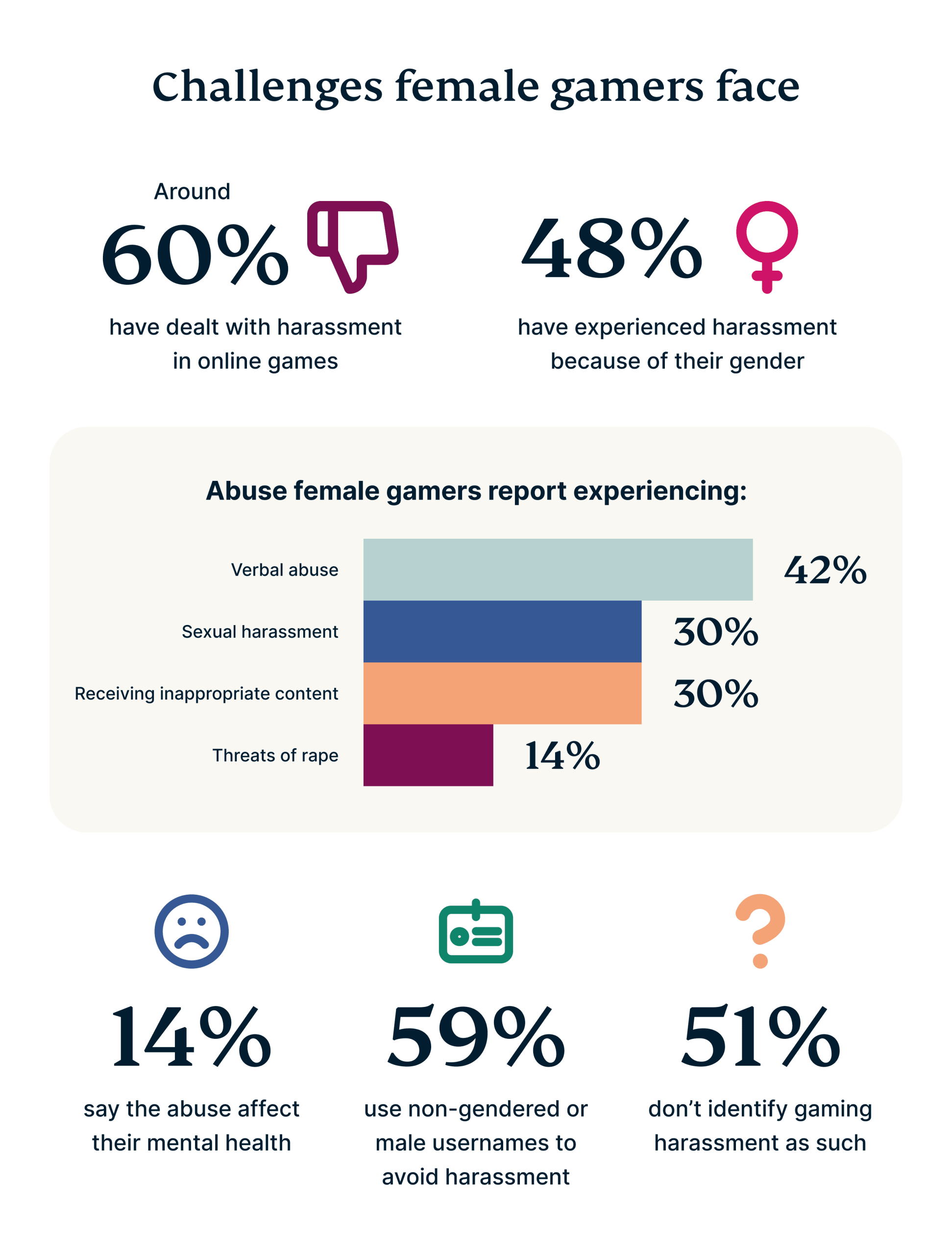 Les abus ne sont pas seulement des taquineries anodines — ils sont personnels. Selon une étude de Women in Games, 30 % des femmes gamers ont été confrontées au harcèlement sexuel, et une autre part de 30 % a reçu du contenu inapproprié. Encore plus inquiétant, 14 % des femmes ont signalé avoir reçu des menaces de viol, et 42 % ont été confrontées à des abus verbaux lors de sessions de jeu en ligne.