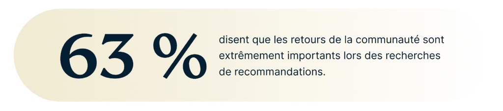 Parmi ceux-ci, 24 % s'appuient fortement sur les avis communautaires, les plaçant au cœur de leur processus décisionnel. Des plateformes comme Reddit, Facebook et X prospèrent sur cette dynamique, offrant des retours authentiques, des commentaires et des conseils adaptés à chaque situation. De plus, 39 % des répondants jugent ces avis importants et les utilisent fréquemment en complément d'autres sources pour orienter leurs choix.