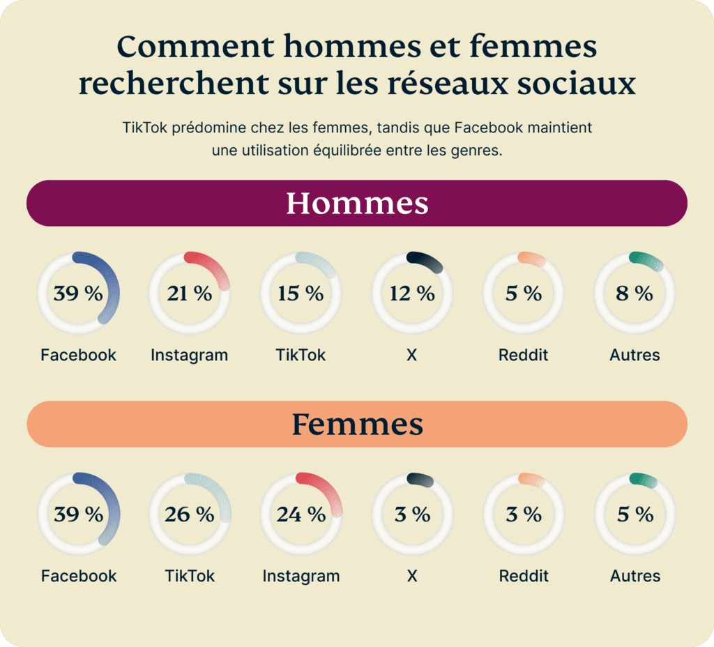 Les différences de genre sont également significatives. Les femmes utilisent davantage les réseaux sociaux pour leurs recherches quotidiennes : 66 % en France contre 63 % à l’international. Les hommes, bien qu’en retrait, suivent de près avec 62 % en France et 57 % globalement.