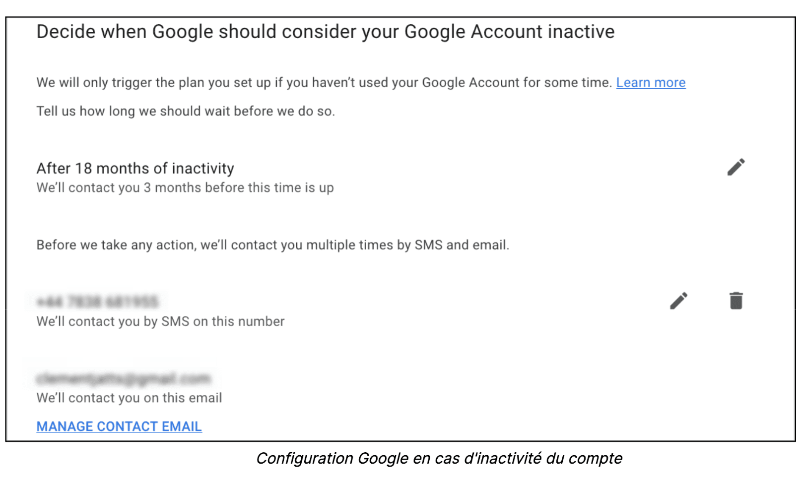 Le gestionnaire de comptes inactifs permet aux utilisateurs de gérer leurs comptes (y compris YouTube) après une certaine période d'inactivité. Vous pouvez configurer cette fonctionnalité pour envoyer une notification à vos contacts de confiance ou supprimer votre compte après trois, six, douze ou dix-huit mois d'inactivité. Si aucune configuration n'est mise en place, les membres de la famille ou les représentants légaux peuvent demander la fermeture du compte à titre posthume en fournissant les documents nécessaires.