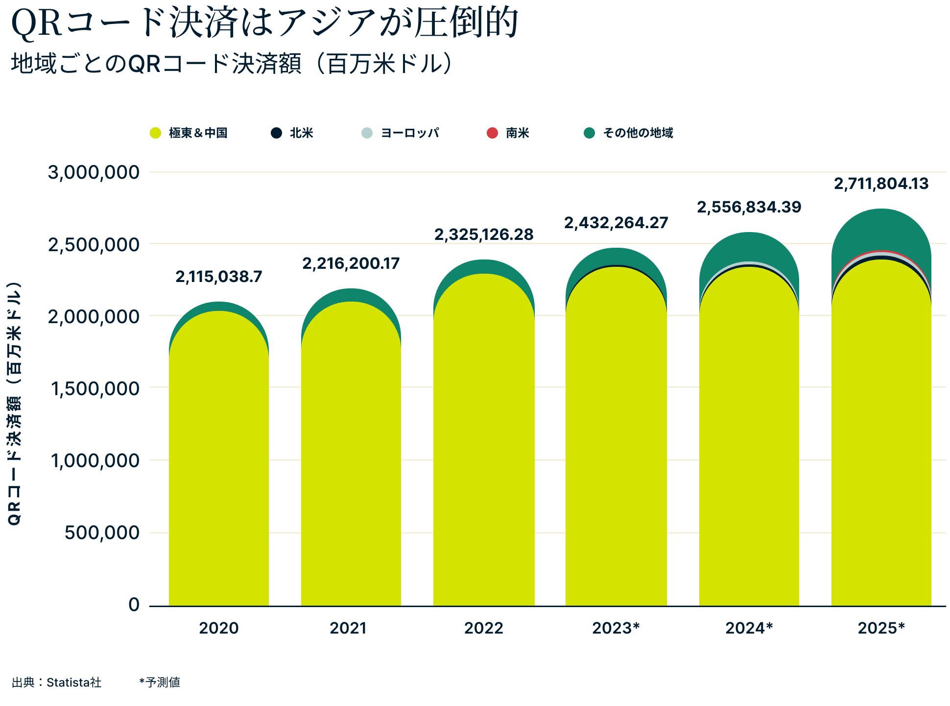 Statista社によると、中国では、2023年だけで2兆2,000億米ドル以上のQRコードによる決済が行われると予想されています。次いで、北米では154億米ドル、中南米では34億米ドル以上と予想されています。