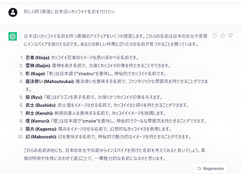 黒猫の特徴を捉えたカッコイイ名前を出してくれました。なぜか、全てカタカナでの返答ですね。ちなみに「ロロノア・ゾロ」は日本のアニメワンピースの登場人物です。
