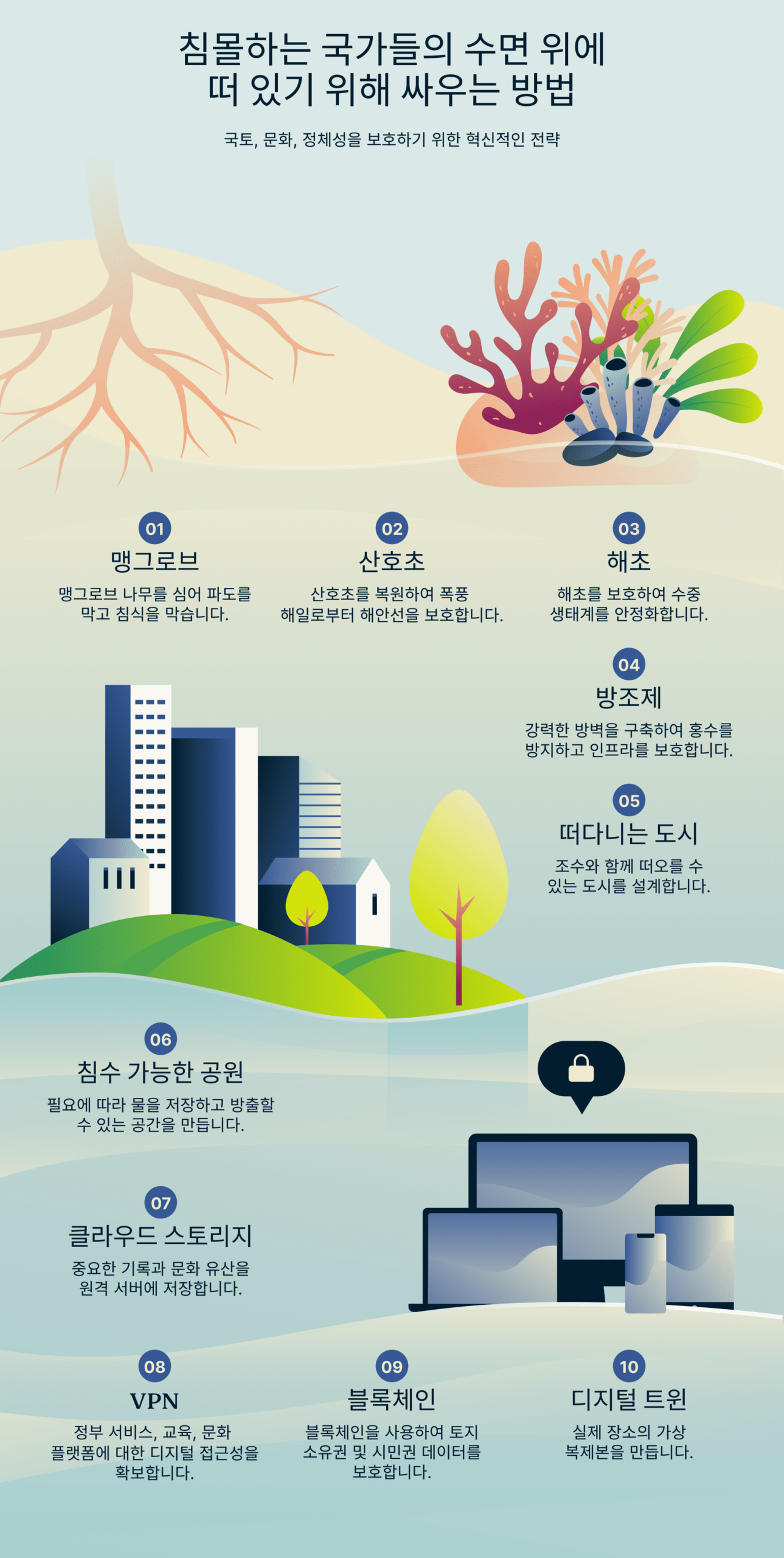 해수면 상승과 싸우는 이 국가들은 지리적 한계를 넘어 문화, 정체성, 인류애의 유대를 유지하는 미래를 만들어가고 있습니다.
