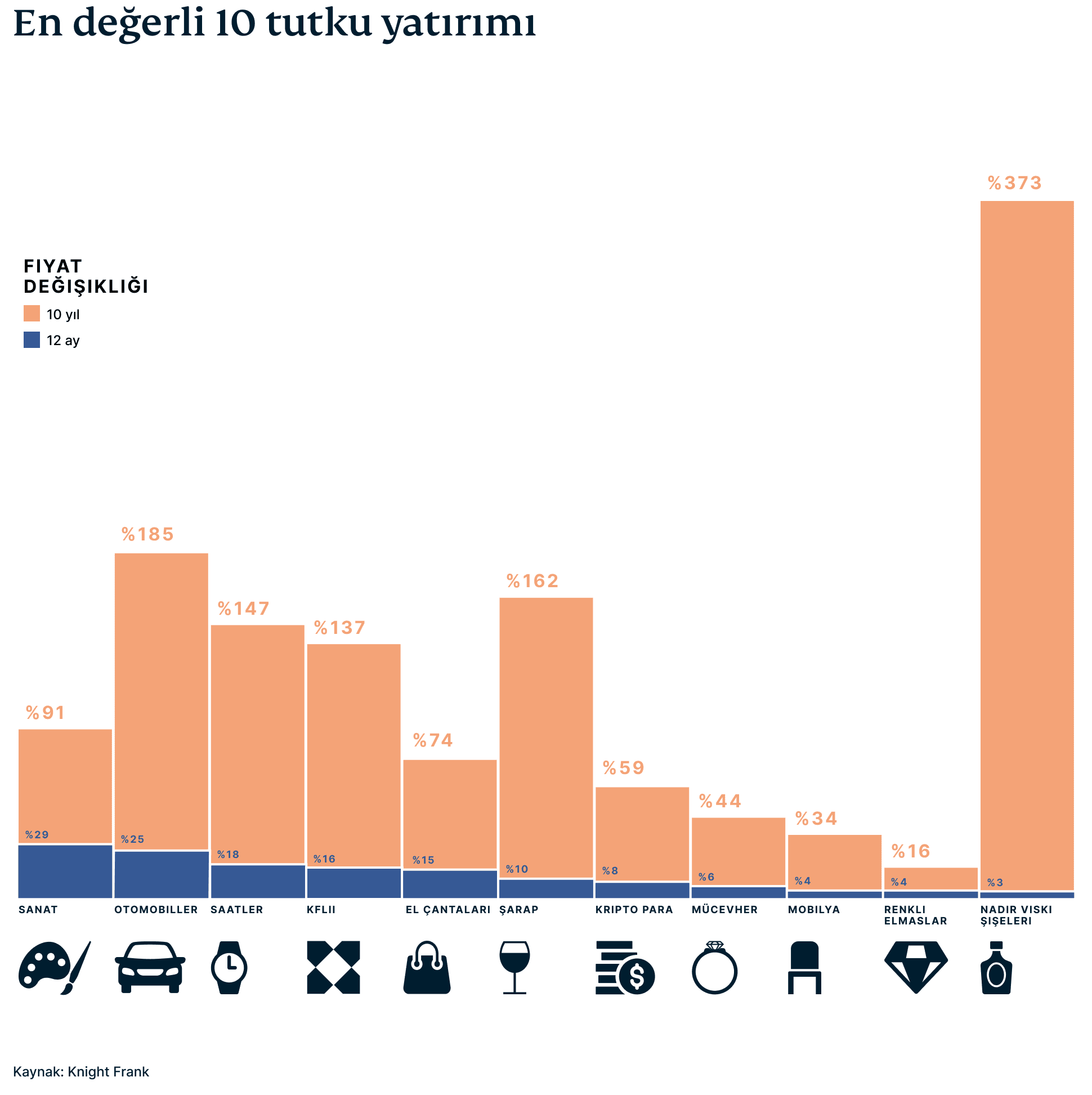 Söz konusu tutku yatırımı sınıfı olduğunda, Knight Frank'in (KFLII) 2022 Zenginlik Raporuna göre, nadir bulunan viskiler açık ara lider konumunda ve 10 yılda %373'lük büyüme oranına sahip. İlginç bir şekilde, viskinin değerini belirlerken; yaşı, nadirliği ve genel kalitesi gibi birçok faktör etkiliyor.
