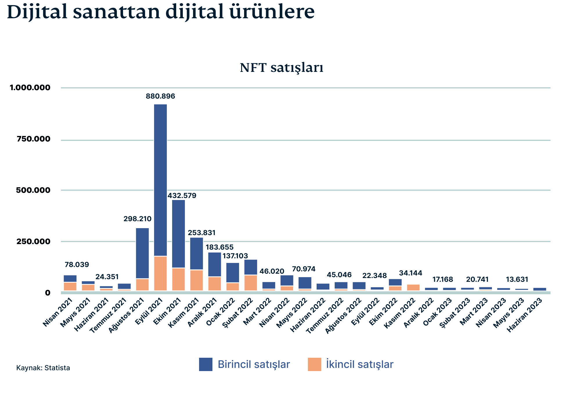 NFT pazarının düşüşüne birçok faktör katkıda bulundu. Önemli bir faktör, NFT'lere karşı azalan heves oldu ve birçok kişinin bu teknolojiye şüpheyle yaklaşmasına neden oldu. Aşağıdaki grafik, Nisan 2021 ile Haziran 2023 arasında NFT satışlarının aşağı yönlü eğrisini gösteriyor.