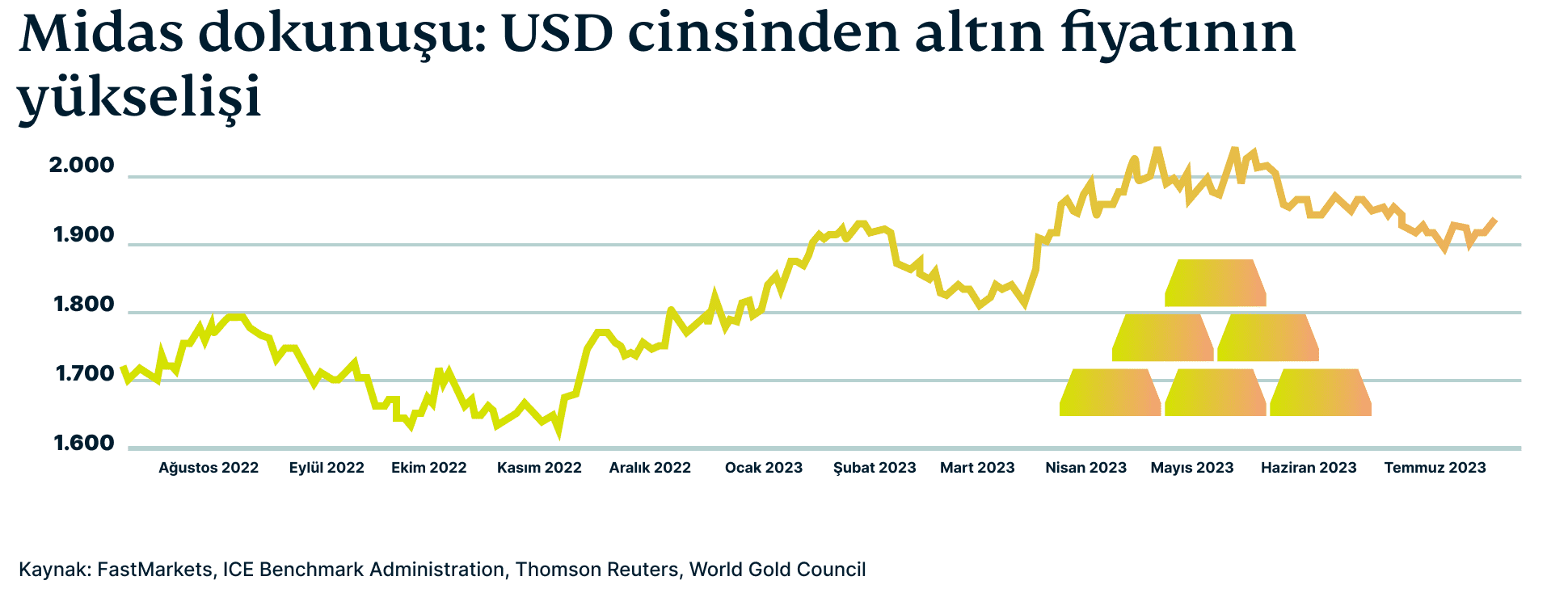 Bir finans dergisi olan Barron’s raporuna göre, altının ons fiyatı bu yılın Nisan ayında 2 bin ABD dolarını aştı ve bu fiyatıyla, tarihteki en yüksek ikinci değerine ulaştı. Finans dergisi; daha zayıf Amerikan doları, düşen bono getirileri ve ekonomik durgunluk olasılığı gibi faktörlerin altına olan ilgiyi teşvik ettiğini belirtti.