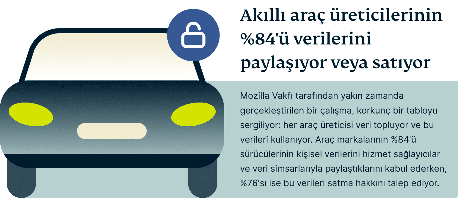 • Yakın zamanda gerçekleştirilen bir araştırma, neredeyse her otomobil üreticisinin sürücüler hakkında bilgi topladığını ve %84’ünün de bu verileri paylaştığını veya sattığını gösteriyor.